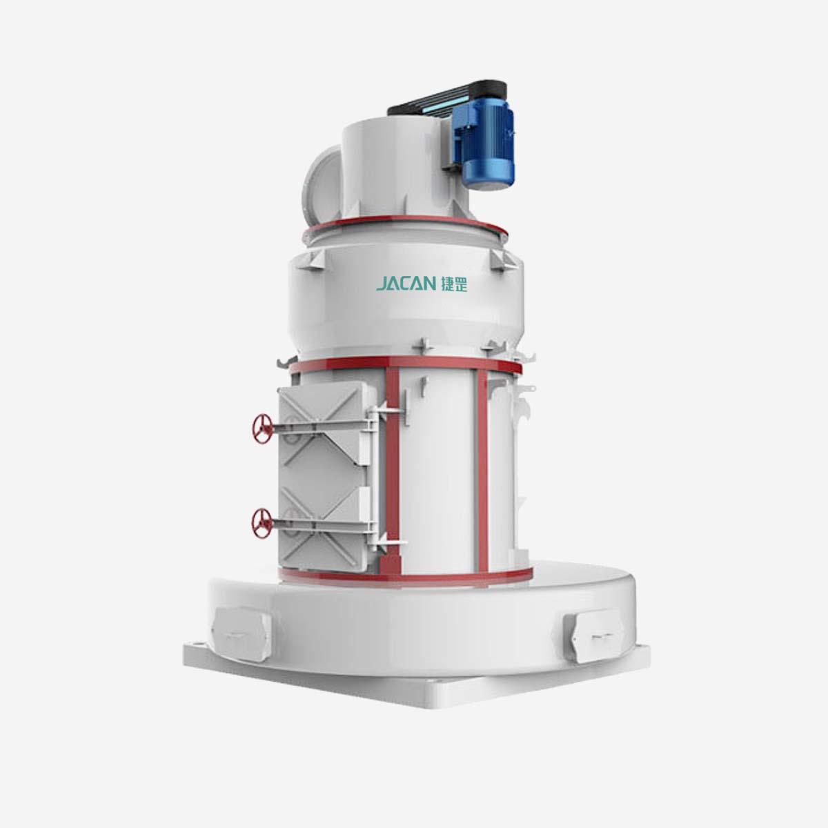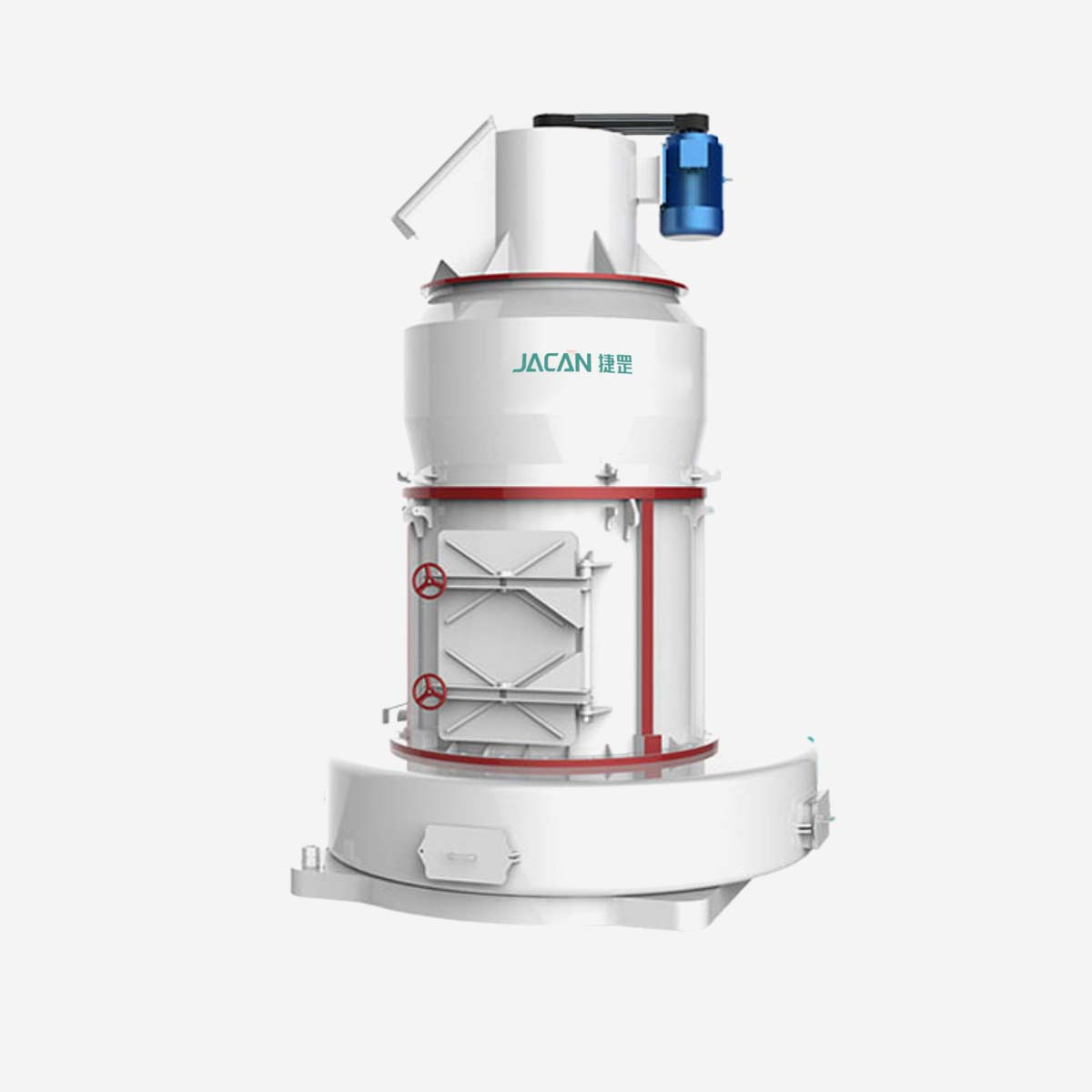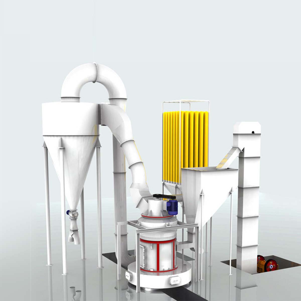 يقوم المحرك الكهربائي بتدوير صندوق التروس (المخفف)، مما يؤدي إلى دوران بكرات الطحن داخل الماكينة الرئيسية. بعد سقوط المواد في غرفة الطحن، يتم رفعها بواسطة شفرات الرفع الدوارة (المجارف) وإرسالها إلى الفجوة بين بكرات الطحن وحلقة الطحن. وتحت تأثير قوة الطرد المركزي، تضغط بكرات الطحن بقوة على حلقة الطحن لسحق وطحن المواد.