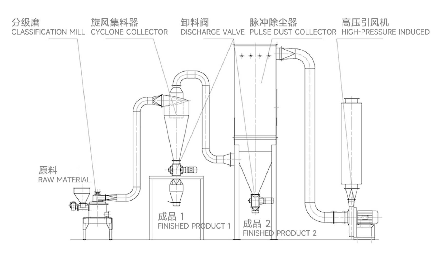 The grinding disc and classifying impeller are driven by their respective driving systems, the speed of the classifying impeller is adjustable to meet different size requirements. The spiral feeding system is located on the inner wall of the machine and is used to send materials uniformly into the grinding chamber, the amount can be adjusted by rotational speed.