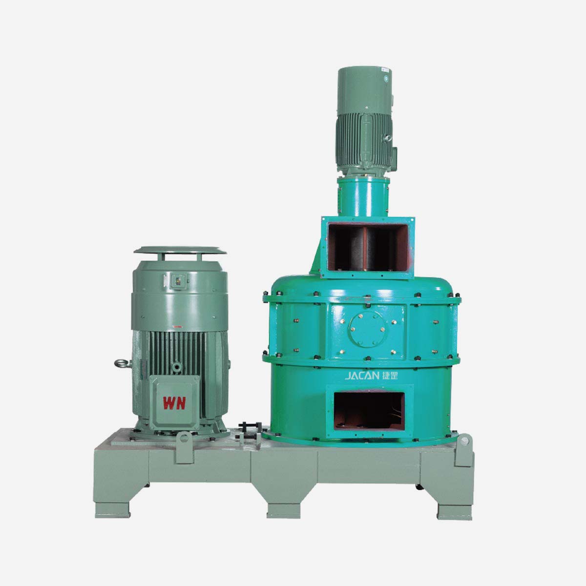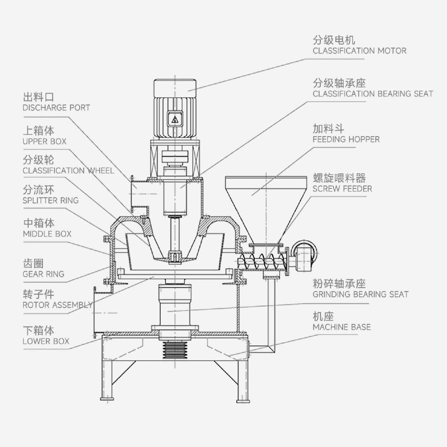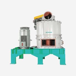 The grinding disc and classifying impeller are driven by their respective driving systems, the speed of the classifying impeller is adjustable to meet different size requirements. The spiral feeding system is located on the inner wall of the machine and is used to send materials uniformly into the grinding chamber, the amount can be adjusted by rotational speed.