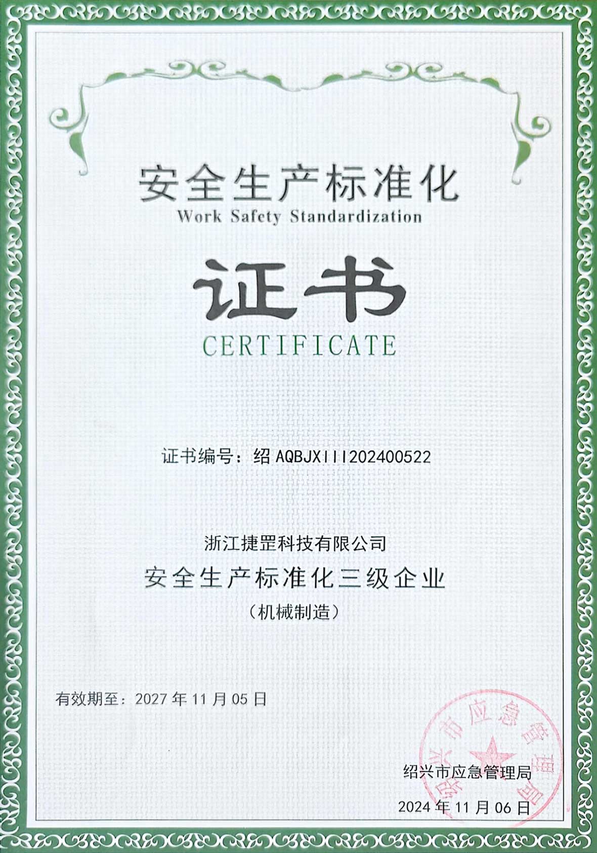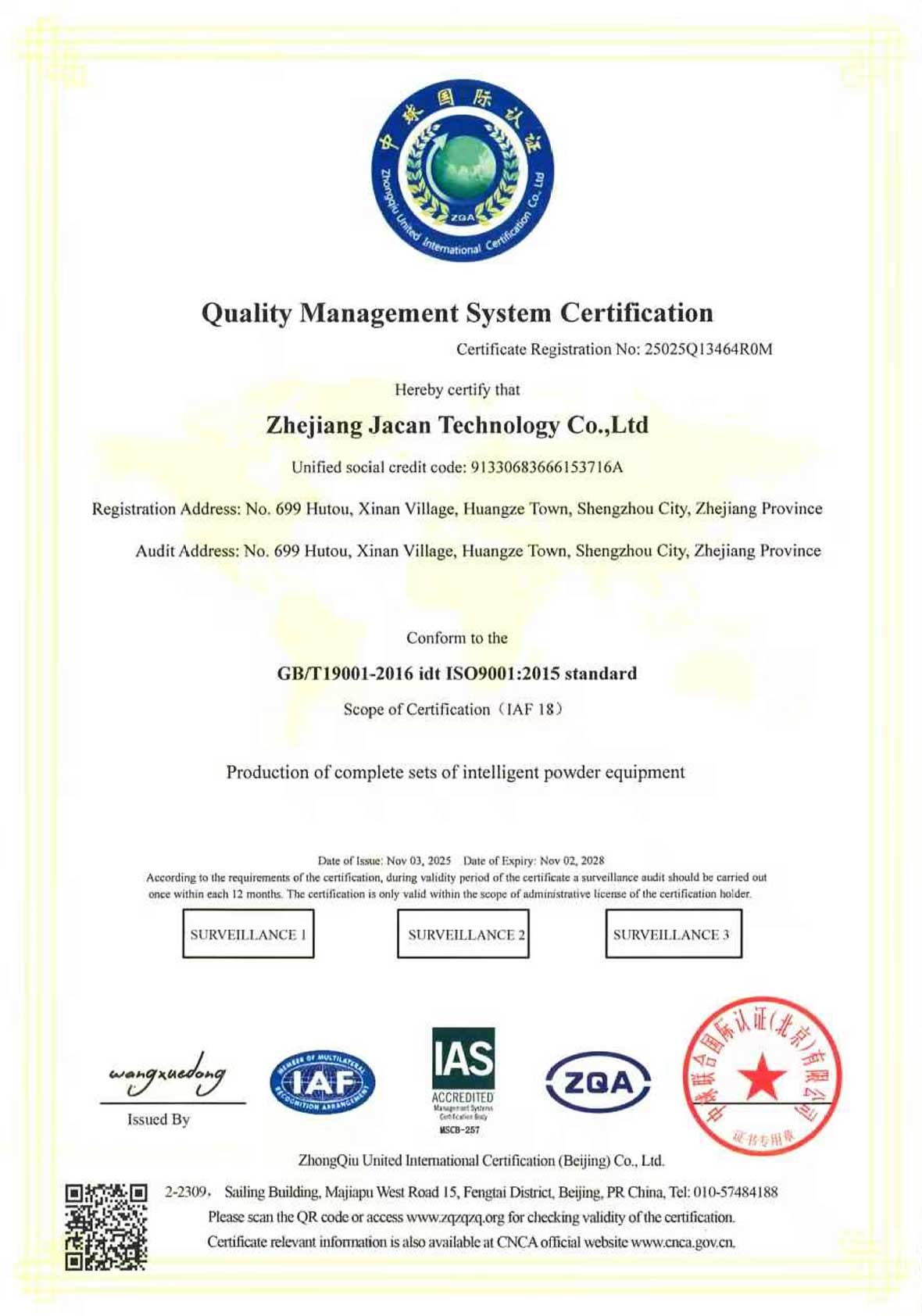 En 2022, la planta de Zhejiang pasó a llamarse oficialmente «Zhejiang JACAN Technology Co., Ltd.» y recibió el «Premio al Progreso en el Desarrollo Económico» del Gobierno Popular de la localidad de Huangze, ciudad de Shengzhou. Asimismo, la empresa obtuvo las certificaciones ISO 9001 del Sistema de Gestión de Calidad y ISO 14001 del Sistema de Gestión Ambiental.