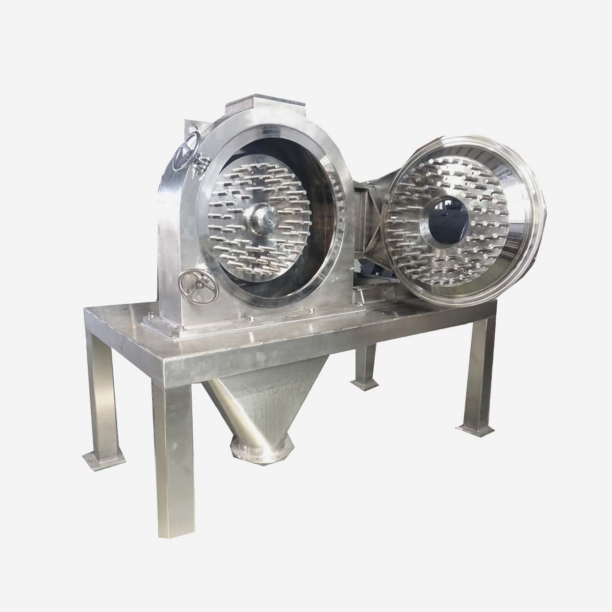 핀 밀(Pin Mill)은 효율적인 초미분쇄 설비입니다. 핵심 부품은 독립적으로 고속 회전하는 두 개의 분쇄 디스크(또는 하나는 회전하고 하나는 고정된 형태)로 구성되며, 디스크 표면에는 바늘 모양 또는 치아 모양의 부품이 균일하게 배치되어 있습니다. 작동 시 두 디스크는 상대적인 고속 운동을 통해 전단력, 충격력 및 연마력을 발생시키며, 이를 통해 원료를 마이크론 또는 나노 단위까지 빠르게 분쇄함과 동시에 재료의 분산(Dispersion)을 실현합니다.